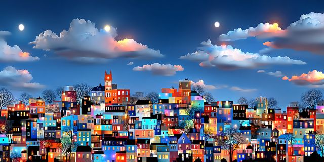 As dusk folds over the cityscape of Fayetteville, a symphony of colors and lights comes alive in this stunning piece of art. The skyline is not just a simple portrayal of an urban landscape but a vivid canvas painted with deep blues, vibrant oranges, and fiery reds, each building aglow as if lit from within. The artwork captures Fayetteville in a magical twilight ambiance, where the fading daylight meets the sparkle of the city lights. The cool blues of the sky contrast dramatically with the golden hues reflecting off the metallic architectures, creating a visual feast that draws the viewer into a moment suspended between day and night.
