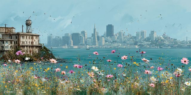 Envision being transported to the scenic boundaries of San Francisco, where the gritty historical presence of Alcatraz Island contrasts boldly against a jubilant sprawl of wildflowers. This vivid artwork dramatically captures this juxtaposition, featuring a rich tapestry of colors and textures that enchant the observer’s senses. Beyond the delicate foreground of pastel petals fluttering slightly in the Pacific breeze, the iconic silhouette of San Francisco’s cityscape extends into the misty horizon. The once formidable island fortress, now a solemn sentinel at the Bay’s entrance, stands as a poignant reminder of past epochs amid the urban vibrancy visible afar. The ethereal canvas not only decorates the landscape but also evokes a myriad of emotions, gently tugging at the strings of nostalgia and wonderment through its portrayal of nature reclaiming its rights in the midst of human history. The viewer is drawn into the composition by the harmonious blend of natural beauty with urban sophistication. Here, the art comes alive, weaving a narrative that transcends time and space, inviting individuals to pause and reflect on the layers of history and beauty that coexist in one frame.