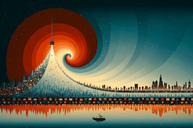 Plunge into the fantastical realm where imagination melds seamlessly with iconic urban landscapes. In this breathtaking artwork, the New York skyline unfolds in an unexpected symphony of Mobius curves, evoking a sense of endless possibilities. As twilight cascades over the city, a radiant swirl of warm orange and dusky blues dominate the canvas, drawing the viewer into a vortex of vivid hues and dynamic forms. Below, the mirrored surface of the water enhances the visual spectacle, reflecting each detailed contour and glowing light of the cityscape above. This piece captures a surreal fusion of reality and fantasy, reminiscent of the vivid scenes and inventive spirit of the Burning Man festival. Each building is delicately rendered, suggesting a city alive with silent stories and bustling unseen lives. A solitary boat glides through the water, its journey tiny yet poignant amidst the grand scale of the city’s architectural marvels. This artwork invites viewers to lose themselves in its depth, exploring the intersection of creativity and urbanity.