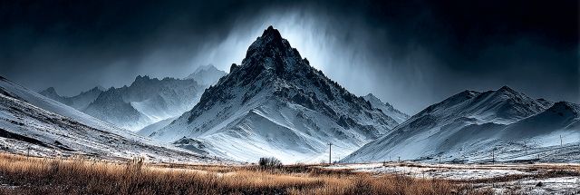 Enveloped by the chill of winter, the regal mountain stands as a sentinel against the swirling tempest above. Its peaks, jagged like the jaws of time, pierce the heavy, rolling clouds that loom with a promise of snow. The light, an artist's subtle brushstroke, weaves between clouds and mountain, highlighting the dramatic contrast between the darkened sky and the pristine whiteness of the snow-covered slopes. In the valley, the sparse wild grasses, dusted with frost, bow under the breath of the coming storm, creating a dance of shadows and textures that tempt the imagination. This landscape is not merely an image but a narrative set in nature's own amphitheater, where each element plays a crucial part in a larger, breathtaking spectacle of wilderness and winter's touch.