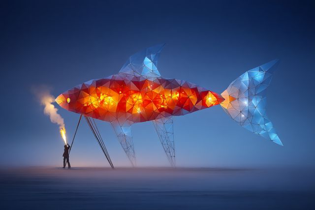In the serene expanse of an ethereal desert, under a twilight sky, the surreal spectacle of geometric jellyfish lanterns captivates and intrigues. A lone figure, torch in hand, stands beneath an enormous, glowing sculpture that mimics the elegant form of a jellyfish. The structure is crafted from a web of translucent, sharp-edged panels, each glowing with a fiery orange light at the center that fades to a calm blue, reminiscent of deep ocean waters. These luminous creatures, supported on slender, stilt-like legs, float above the ground, their ethereal beauty a stark contrast to the barren landscape below. This artwork captures the spirit of adventure and invention, characteristic of the famed Burning Man Festival where boundaries of art and engineering blur. The vibrancy of the colors and the implied motion of the jellyfish amidst the stillness of the desert creates a poignant juxtaposition of movement and tranquility, encouraging viewers to ponder the harmony between technology and nature.