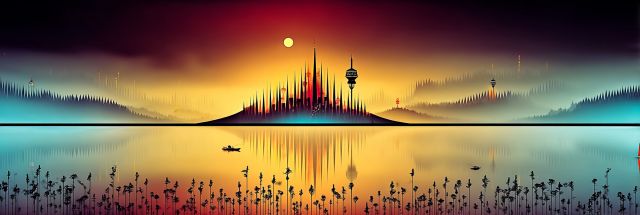 Surreal Sunset Over Reflective Waters: A Vibrant Cityscape Canvas