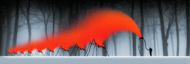 As the cold, pale light casts shadows among age-old trees, a surreal assembly comes to life in a hauntingly beautiful spectacle. In a mystical forest blanketed in fog, a caravan of ants defies the typical insignificance of their natural form, taking on a monumental task. Through the subdued color scheme, a striking, fiery orange arc spills from a celestial container carried by these minuscule giants. The ants, aligned like a meticulous procession, introduce a dynamic contrast to the stillness of the fogged woods. This imagery, evocative of internal versus external struggles, might symbolize the human quest to harness and carry on despite seemingly insurmountable odds. The artwork stirs an emotional narrative: an expression of persistence, burden-bearing, and unity in the face of an opaque and immense universe. The ethereal scene invites the viewer to contemplate themes of community, the weight of existence, and the beauty arising from shared burdens. Much like the vivid splash of orange that ruptures the monochrome, there is a warm, underlying hope that glows incessantly—even in the chill of obscured and unsure pathways.