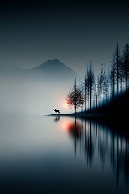 Serene Wilderness at Twilight: Moose by a Reflective Mountain Lake