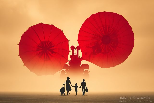 Bathed in the golden glow of the desert sun, a family strides together across a barren landscape, their silhouettes sharp against the blazing horizon. In their hands, they hold large, vivid red umbrellas that catch the light, casting long, intricate shadows on the sand beneath their feet. The scene is an intriguing blend of reality and fantasy, reminiscent of a dream or a distant memory. The umbrellas, oversized and strikingly colored, seem almost magical, suggesting a narrative of adventure and mystery. Behind the family looms a giant mechanical structure, its intricate design and imposing form a stark contrast to the natural simplicity of the desert. This juxtaposition of the organic and the mechanical adds a layer of complexity to the image, inviting viewers to ponder the story behind this unusual trek across the dunes. The use of warm, monochromatic tones envelops the scene in a sense of warmth and unity, highlighting the bonds that hold the family together as they navigate this surreal landscape.