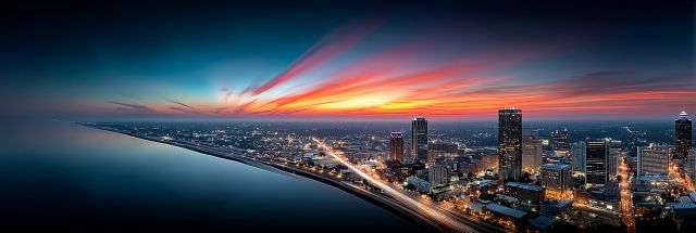 As the sun descends on the horizon, the Memphis skyline emerges as a breathtaking spectacle of urban brilliance and festive glory. On this iconic Fourth of July, the city is draped in an enchanting golden hue, punctuated by audacious streaks of crimson and amber that streak across the sky, mirroring the celebratory fireworks synonymous with American Independence Day. The panorama offers a masterful composition where nature and civilization converge in a symphony of lights and color.