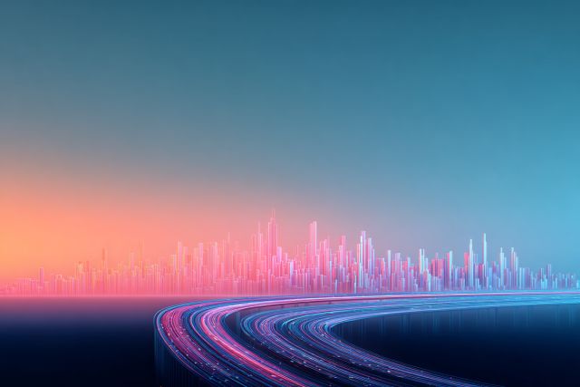 As evening unfurls its cloak across the skies, a mesmerizing urban panorama comes alive in an ethereal blend of blues and fiery golden hues. This artistic interpretation captures the vibrant energy of a city destined for everlasting prosperity, illustrated through a golden highway that symbolizes the journey towards economic triumph. The highway, a flawless ribbon of light, twists gracefully, guiding your eyes towards the luminous skyline that transforms the dusk into an oasis of digital artistry.