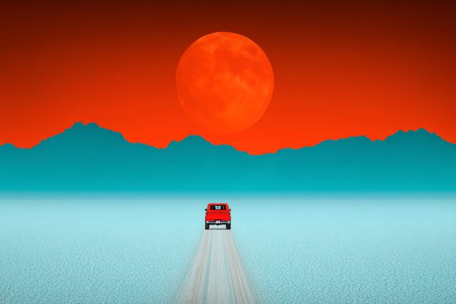 As if pulled from a world that exists only within the bounds of imagination, the stunning artwork captures the essence of adventure and expansiveness. A lone red vehicle symbolizes resilience and continuity, contrasting sharply against a desolate, yet beckoning desert landscape under a massive, mesmerizing blood moon. The striking scene unfolds with the road diminishing into a vanishing point that entices the observer to embrace the unknown. The serrated silhouette of distant mountains forms a dark line against the fiery red sky, suggesting an untouched, mysterious wilderness. Painted in surreal shades, the sky transitions from a soothing turquoise to a deep, intense red, evoking the fervor and passion of unseen celestial dances. Feel the warm, balmy air that seems to echo the emptiness and fullness of life on such transcendent journeys, where reality blends with artistic expression. The symbol of the road hints at continuity and the infinite allure of exploration, inviting viewers to contemplate their paths, destinations, and the roads left untraveled.