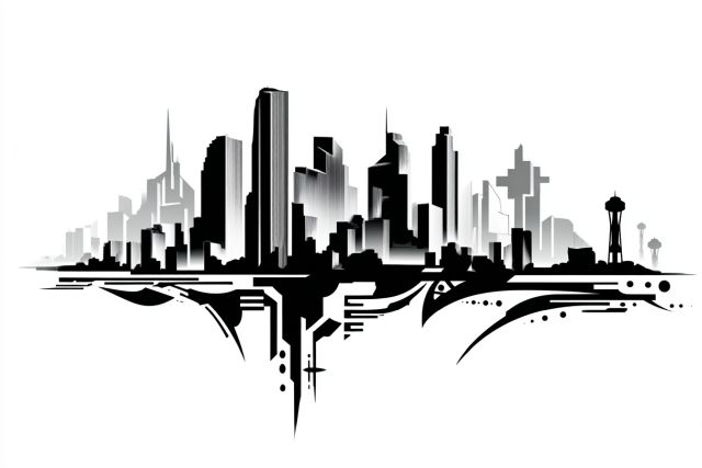 Witness the dynamic play of black and white in this evocative depiction of Houston's skyline, where the architecture soars into the sky as monuments of human ingenuity. The composition brings to life the bustling Texan city through extreme detailed contours that juxtapose towering skyscrapers with iconic structures, like the unmistakable outline of the San Jacinto Monument and the famed Astrodome. Each line is meticulously drawn to capture the essence of Houston, reflecting its status as a vibrant hub of energy, technology, and culture. Shadows and highlights intermingle on this canvas, creating a visual symphony that speaks to the viewer's soul, offering a glimpse into the city's robust urban spirit and its serene horizons. This artwork invites you to pause and reflect on the coexistence of progress and tradition, encapsulated within the borders of one of America's most dynamic cities.