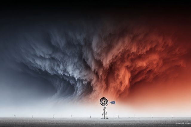 Unveiling a dramatic convergence of nature's fury and serenity, this captivating image artfully juxtaposes an iconic windmill standing resilient against a breathtaking storm. As if sculpted by an unseen artist, the turbulent sky swirls with ominous shades of red and gray, enveloping the horizon in a chaotic yet mesmerizing dance. The stark landscape, painted with minimalistic grace, serves as the canvas for this raw display of atmospheric power. With each gust of wind, the windmill's blades spin, a testament to human ingenuity in the face of nature's indomitable will. Viewers are transported to a realm where silence pervades, broken only by the howling winds that command the heavens. The stark contrast between the peaceful solitude of the windmill and the violent tempest encapsulates a profound narrative about resilience and the timeless battle between man and nature. This visual odyssey not only captures the eye but also stirs the soul, inviting contemplation on the delicate balance between ecological harmony and the wild unyielding forces that shape our world.