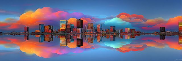 As the sun dips below the horizon on the Fourth of July, the Boston skyline erupts in a symphony of colors, captured exquisitely in this breathtaking canvas. The city's famous buildings bask in the fading daylight, reflected perfectly in the calm waters beneath, creating a mirror image that doubles the visual feast. Each window in the towering skyscrapers glimmers like a star, adding sparkle to the velvety evening sky. The vivid clouds, painted in strokes of deep oranges, radiant yellows, and soothing blues, evoke a sense of deep calm interspersed with festal excitement, embodying the spirit of Independence Day. This panorama not only illustrates the architectural elegance of Boston but also the vibrant energy of a city in celebration. As fireworks are poised to ignite, this moment of peaceful reflection in a bustling city provides a contrast that invites viewers to explore the depths of the artwork’s details and textures. Engulfed in an otherworldly glow, the city seems almost magical, a serene island in a sea of golden light. This piece is a testament to the photographer’s ability to harness the ephemeral beauty of natural light, intertwined with human celebrations, to create a lasting impression of awe and wonder.