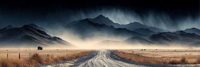 Imagine a world where time slows its relentless pace, and the heavy air of unfolding drama thickens around desolate, eerie landscapes. At the heart of this visual journey, a lonely road meanders through an expanse of barren terrain, drawing viewers into a realm where the mundane fades and the elemental takes over. The weave of this road through such austere beauty mirrors the twists and turns of life's own paths. Each curve and the gravel beneath speak to the solitude and resilience required to traverse this formidable world. Storm clouds, dense and menacing, gather above distant mountains, their peaks lost in the haunting embrace of mist. These mountains, clothed in the mystery of unfathomable dark blues and grays, preside over the scene with a dignified grace, silent witnesses to the ages. On either side, the landscape stretches, a tapestry of subtle browns and muted greens, occasionally broken by what appears as a shed—a solitary silhouette against the overwhelming vastness. The starkness of the shed in such vast emptiness evokes a sense of isolation and abandonment yet also offers a poignant reminder of human presence, resilience, or perhaps surrender. As the fading light battles with shadows, every element combines to create a tableau that resonates with the echoes of forgotten stories and the whispers of the wind. This image not only captures a moment of visual poetry but also invites the viewer to feel the crispness of the advancing storm and to hear the silent stories told by the abandoned paths and resigned structures.
