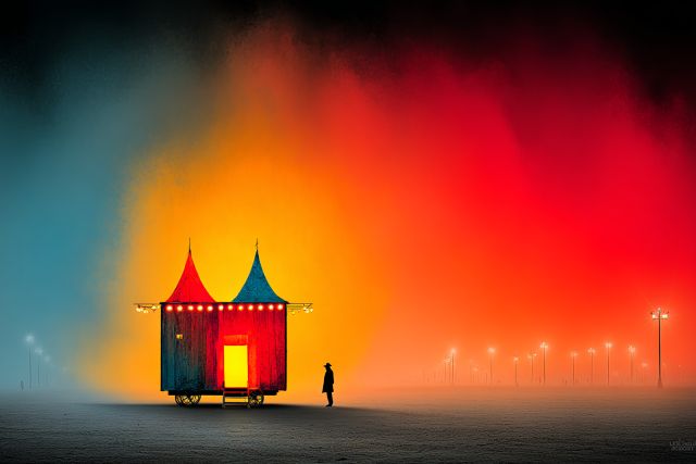In a mesmerizing blend of vivid hues and stark silhouettes, this breathtaking artwork transports viewers to a realm that transcends the ordinary. Underneath a vast expanse of twilight sky, a vibrant eruption of crimson, gold, and midnight blue paints a surreal tableau, reminiscent of a fantastical festival. Amidst this dreamlike spectrum, a solitary figure stands next to a whimsical structure reminiscent of a carnival booth, its steeples piercing the foggy air with an almost magical aura. The sharp contrast between the warm, luminous glow of the booth and the foreboding, mysterious darkness imbues the scene with a poignant sense of introspection and solitude. The grounding presence of a line of street lamps stretching into the distance adds a layer of enigmatic calmness to the scene, guiding the viewer's eye towards the endless possibilities that lie beyond the horizon. Each element in this canvas collaborates to evoke a sense of wonder, adventure, and contemplation, making it a profound statement piece in any art collection.