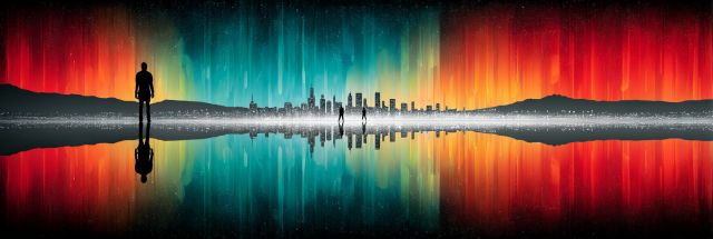 Envision an ethereal dance of colors as the Aurora Borealis stretches itself over the iconic Los Angeles skyline, creating an extraordinary fusion of natural spectacle and urban silhouette. In this arresting depiction, the night sky is ablaze with ribbons of green, blue, and red, igniting the horizon with an otherworldly glow. The city’s familiar contours, punctuated by towering structures, stand sharply against the vivid backdrop, reflecting an intense, almost surreal, mirror image upon the tranquil waters below. At the heart of this visual symphony, stands a lone figure, perhaps a wanderer or a dreamer, silhouetted against the grand tapestry of light. This figure adds a poignant touch of humanity, suggesting a quiet contemplation of nature’s grandeur juxtaposed with human achievement. As the colors ebb and flow, they seem to whisper secrets of distant cosmic ballets, bringing a touch of the sublime to the bustling city life. This unique blend of fire-like auroras and the serene cityscape is reminiscent of scenes from visionary festivals such as Burning Man, where art and elemental forces dramatically collide. This artwork is more than just a print; it's a gateway to a dream-like state where the marvels of the cosmos play over human creations.