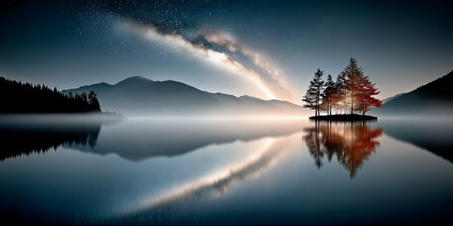 Under a blanket of stars, a tranquil scene emerges as the dark, deep blue of the night sky melds with the still waters of a mountain lake. The Milky Way, a celestial river of light, stretches across the vast expanse, its brilliance mirrored flawlessly by the lake's glassy surface. Along the shoreline, silhouettes of pine trees stand sentinel, their needle-clad branches whispering in the gentle night breeze. This enchanting landscape, suspended between sky and water, invites viewers to pause and reflect on the serene beauty of the natural world. The distant hills roll softly under the moon's gentle illumination, completing this picturesque setting. The scene is a delicate balance of elements—light and shadow, earth and water, stillness and motion—crafted into a harmonious symphony that captivates and soothes the soul. This panoramic view not only illustrates the serene solitude of night but also evokes a profound sense of introspection and cosmic wonder. The rich, tonal blues and subtle gradients create a soothing palette that translates the night's allure into visual poetry. Amidst this dreamy nightscape, one feels a deep connection to the cosmos, a reminder of the small yet significant place we hold within it.