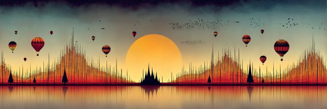 In a breathtaking symphony of colors, a vibrant crimson sun dips low behind an exaggerated, spiked skyline. This city, rendered with stark outlines and an almost ethereal symmetry, shimmers above the mirror-like surface of a tranquil water body, which perfectly reflects the spectacle above. Effortlessly floating across this surreal landscape, a flotilla of hot air balloons adorns the sky, each adorned with a unique pattern, casting subtle shadows on the water below. The artwork draws its inspiration seemingly from a world where reality intertwines with fantastical elements, capturing the fiery glow of dusk paired with a serene yet mysterious cityscape silhouette. The horizon melds with the water, creating an endless loop of mesmerizing reflection, while the silhouette of a far-off forest punctuates the skyline. This piece evokes a sense of adventure and tranquility, urging the viewer to explore not only the boundaries of the natural world but also the limits of their imagination.