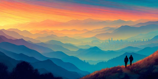As the sun retreats below the horizon, it graces the landscape with a symphony of colors, casting shades from deep indigo to fiery oranges across the vast canvas of the sky. This artwork captures a scene where nature and urban life converge in harmonious contrast, portrayed through the silhouette of San Francisco’s skyline in the far distance. Two hikers stand poised on a mountain trail, encapsulated in this moment of fleeting beauty, their figures a testament to humanity's small yet poignant presence in the vastness of the natural world. The rolling hills cascade rhythmically into the muted earth tones of the foreground, each layer a softer echo of the last, leading the eye gently towards the city. This detailed depiction not only celebrates the contrasts between the organic curves of nature and the sharp lines of urban architecture but also evokes a sense of vastness and tranquility. This piece serves as a portal to a serene yet vivid landscape, inviting the observer to linger in the beauty of this ephemeral moment.