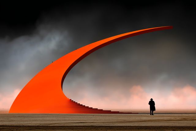 As morning mist dissipates under the brooding sky, a striking, sweeping curve of vibrant orange slashes through the gray expanse of an endless horizon. This solitary sculpture, reminiscent of the creative spirit of Nevada's Burning Man festival, stands boldly as a monument to both human ingenuity and isolation. Each step of the staircase ascending the curve invites onlookers into a physical and metaphorical journey upward and inward. Below, a lone figure, dwarfed by the monumental scale of the artwork, contemplates the ascent, perhaps musing on challenges personal or professional. The fierce color of the sculpture provides a stark contrast to the softened skies behind, a visual metaphor for the flame of human creativity and resilience burning against the often-overwhelming forces of nature and circumstance. This image, evoking a sense of introspection and awe, serves not only as a piece of art but as a narrative on the human condition.