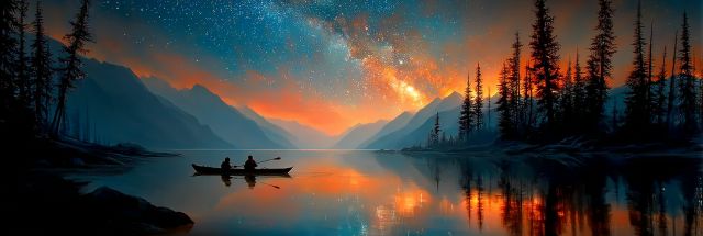 Beneath the jeweled expanse of a Milky Way sky, two kayakers glide silently across a mirror-like mountain lake, their paddles barely causing a ripple in the still waters. This breathtaking scene captures not just the tranquil beauty of an untouched wilderness but the profound interaction between humanity and the cosmos. The distant skyline serves as a subtle reminder of urban existence, contrasting sharply with the surrounding natural splendor. Framed by towering pines and imposing peaks, the composition invites viewers into a celestial dance of light and shadow. The starry backdrop illuminates the scene with specks of white and azure, reflecting brilliantly on the lake's surface. This art piece evokes a deep sense of peace and introspection, urging one to pause and reflect on the vastness above and the quiet solitude around. The dim orange hues of the distant city give way to the vivid blues and silvers of the night sky, creating a color palette that is both soothing and invigorating. Every detail, from the gentle laps of lake water against the kayak to the whisper of the night breeze through the pines, contributes to a tapestry of sensory experiences that is uniquely transporting.