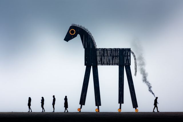 As if plucked from the heart of a dream or another world, an enigmatic silhouette of a towering wooden horse looms against a dense, fog-shrouded backdrop. Descending upon this mystic vista is a procession of human figures, each marching tirelessly across the obscure landscape. The horse, of commanding size and crafted with slats that resemble streaks of shadow, carves a striking figure with its golden eyes glowing somberly in the mist. Plumes of smoke drift lazily from behind, adding a layer of movement and ephemeral quality to the static sculpture. The crisp, gray-scale hues of the scene suggest a quietude that contrasts starkly with the surreal and bold elements of the composition. The interplay of human figures against the dramatic scale of the artifact constructs a narrative of resilience, mystery, and an inquisitive venture into realms unknown. This visual spectacle, ripe with metaphor and invitation to interpretation, not only captures the imagination but also stirs the depths of the subconscious, beckoning the viewer to ponder the crossing of dimensions or perhaps the journey through life’s own vast uncertainties.