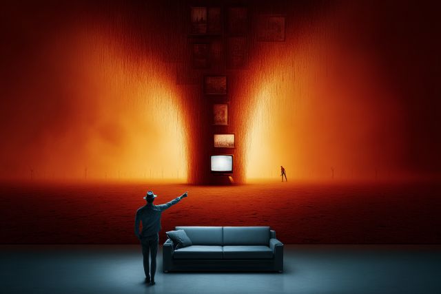 In a mesmerizing blend of reality and illusion, a solitary figure clad in a casual outfit stands in a vast, shadow-drenched room. The walls erupt in a fiery cascade of crimson and orange hues, reminiscent of a descending curtain at the end of a dramatic play. The textured backdrop seems almost liquid; its vibrant colors flow downward with intense energy. Centered in this enigmatic space is a simple, elegant gray couch, a stark contrast to the vibrant explosion behind it. Above it, abstract squares float against the gradient, each framing a smaller, indistinct figure engaged in various poses of contemplation and movement. The mood is contemplative, charged with an air of introspection and the surreal. This composition invites viewers to pause and reflect, to delve into the depths of their imagination and the boundaries of the possible. It’s a visual poem, a dance of light, shadow, and color that both challenges and charms the observer, urging them to question the line between the real and the surreal.