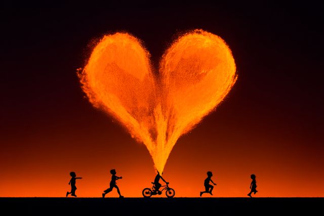 Against the backdrop of an expansive orange sky, an incandescent heart rises with the grace and intensity of a flame. This powerful image, evoking thoughts of the iconic Burning Man Festival, blends the awe-inspiring elements of fire and passion into a singular visual expression. Beneath this scorching heart, the silhouettes of children at play—running and cycling—paint a scenario of innocent joy and continuous motion, contrasting the overwhelming stillness of the flaming heart above. Their lively activities parallel the untamed fire, emphasizing a cycle of relentless energy and vitality.