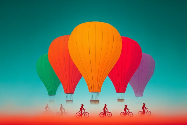 Vibrant Journey: Balloons and Bicyclists Under an Ombre Sky