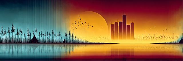 In this captivating canvas, the skyline of Detroit emerges as a silhouette against a spellbinding gradient of sunrise hues. The splash of vibrant oranges and deep blues creates a striking contrast with the stark profiles of skyscrapers, evoking a city awakening from the shadows of twilight. The foreground is a serene mirror-like lake, reflecting the fiery skies and the clustered architectures with pristine clarity, suggesting the duality of urban existence alongside natural beauty. Nearby, a lone tent suggests a transient visitor – perhaps a symbol of humankind's fleeting presence in the eternal cycle of day and night. Above, a flock of birds in flight punctuates the sky, symbolizing freedom and the moving sands of time. This piece is more than just an image; it is a poetic representation of Detroit's everlasting charm and the transient yet timeless whispers of nature that surround it.