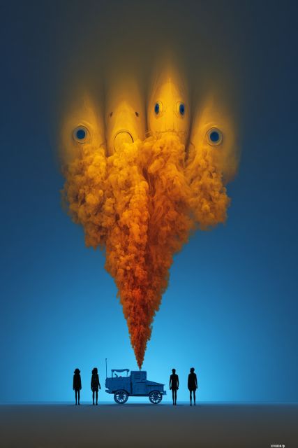 Envision yourself standing under a vast, dusky sky where the surreal and ordinary converge in a dazzling display. Here, an otherworldly creature descends, a majestic entity reminiscent of an immense jellyfish, its tendrils of fiery orange smoke billowing powerfully into the cool blue expanse. This image captures a spontaneous combustion of creativity and fantasy, possibly drawn from the vibrant energy of the Burning Man festival. The scene sets several silhouetted figures against the vibrant light, their calm stances belying the explosive spectacle overhead. This juxtaposition invites viewers into a contemplative space, where the realms of reality blur with the fantastic. The vivid colors craft a backdrop that is both dramatic and serene, encouraging the mind to wander and wonder. An elegy to the power of imagination, this artwork speaks to themes of community, celebration of diversity, alien beauty in familiar settings, and the spark that artistic expression brings to human experience.