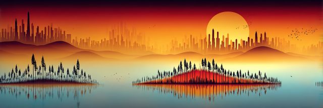 As twilight descends, the landscape transforms into a surreal tableau where the cosmic dance of light melds sea with sky. The horizon burns crimson, casting a warm glow that envelopes a silhouetted skyline looming in the distance. This panoramic view captures an ethereal cityscape, mirrored in the tranquil waters below, creating a perfect symmetry that blurs the line between the real and the imagined. At the heart of this scene are the shadowy islands, punctuated with dense forests that seem to float mid-lake under the immense weight of the sinking sun. Here, the marriage of nature's tranquility and urban complexity invites viewers to lose themselves in contemplation. This art piece encourages the viewer to wonder and wander through its vivid contrasts and reflective surfaces, exploring themes of isolation, renewal, and the infinite cycle of day to night.
