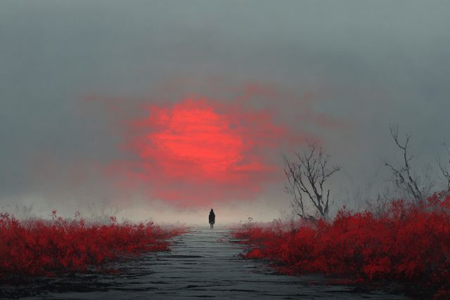 Solitary Figure Against a Crimson Sky: A Hauntingly Beautiful Landscape