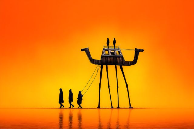 Beneath a sprawling canvas of fiery orange hues, a remarkable scene unfolds that carries the whispers of a dystopian parallel universe. A large, intricate structure, resembling a stilts-based machine, stands as a testament to human ingenuity and surreal artistic thought. It hovers above the glass-like surface, casting elongated shadows that merge with the silhouettes of three figures tethered to the colossal construct. The artwork’s visual journey evokes a myriad of emotions, from the awe of witnessing such an uncanny mechanical marvel to the serenity imparted by the monochromatic golden backdrop. This composition masterfully marries the elements of man-made wonders with the vastness of nature’s color palette, creating a piece that is not only thought-provoking but deeply mesmerizing. The air appears thick with golden light, almost tangible, as if one could reach out and touch the warmth. The artwork invites viewers to ponder narratives of exploration, struggle, innovation, and the pursuit of unknown horizons. It stirs the soul, encouraging a quiet reflection on our journey through the mysterious terrains of life and art.