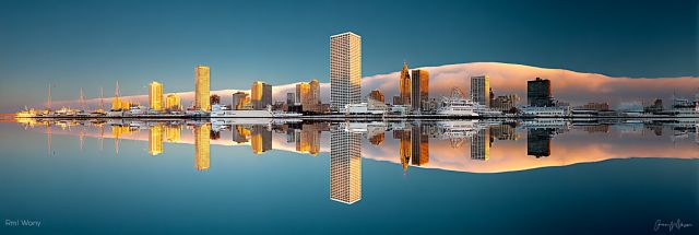 As dawn breaks, the Milwaukee skyline emerges, bathed in a soft, golden glow that hints at the promise of a new day. The scene captures the majestic urban landscape as it reflects crisply on the tranquil waters below, creating a mirror image that doubles the city's grandeur. Towering skyscrapers reach toward a cloudless cerulean sky, their glass facades shimmering in the early sunlight, while the soothing blue of the water complements the warm hues that kiss the buildings. Each structure tells a tale of architectural evolution, from sleek modern designs to stately historic facades that remind onlookers of the city's rich heritage.