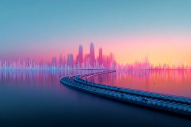 As dusk settles, a stunning visual metamorphosis unfolds where technology meets tranquility. The canvas artfully depicts a highway, not just as a road but as a conduit for economic promise, sweeping elegantly towards a city skyline. Bathed in ethereal twilight, the scene is captured with a highway transforming seamlessly into a shimmering golden financial graph, signifying growth and prosperity. The skyline, a silhouette against a gradient of midnight blue to fiery pink, resembles digital soundwaves that suggest the city's vibrant pulse and economic dynamism.