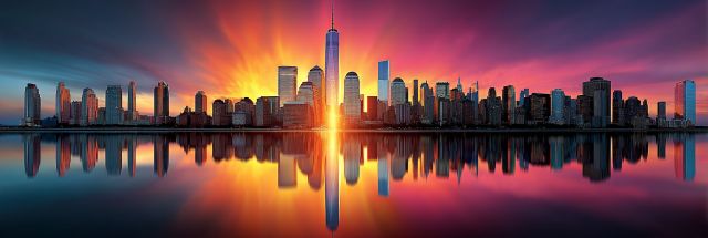 As the sun dips below the horizon, the city that never sleeps lights up, casting a breathtaking reflection over calm waters. The New York City skyline, renowned for its iconic contours and bustling energy, is captured here in a moment of serene beauty juxtaposed against a vibrant Fourth of July sunset. This masterpiece of photography depicts the city's famous buildings, including the towering One World Trade Center, under a sky ablaze with fiery hues of orange, pink, and purple—a stark contrast to the tranquil blue of the impending dusk. The reflections shimmering on the water's surface amplify the grandeur of the moment, offering a mirror image that doubles the spectacle. This image not only captures a visual celebration of independence but also evokes the spirit of New York — robust, resilient, and ever-radiant. As viewers, we are invited to pause and revel in this visual feast, a standing testament to the city's ongoing allure and festive spirit during one of the most patriotic times of the year.