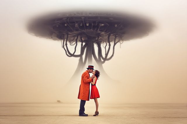 Amidst a sprawling desert, a couple finds solitude beneath an impossibly grand spectacle—an alien craft hovering silently in the muted sky. The starkness of the landscape contrasts with the vibrancy of their attire; her flowing red dress matches his dashing orange trench coat. Both stand, locked in an embrace that bridges the dusty earth and the mysteries floating above. Draped in a tender moment, they seem oblivious to the colossal structure's daunting tendrils and the eerie fog enveloping the scene. This artwork captures a narrative so vivid and otherworldly, suggesting a story of love that defies boundaries, both terrestrial and celestial. It leaves us pondering the narrative behind their rendezvous beneath such an extraordinary anomaly. The surreal backdrop, coupled with their intimate pose, invokes a sense of romance intertwined with the enigmatic, urging viewers to delve into their imaginations for stories of endless possibilities. Is this engagement a declaration, not just to each other, but also to the cosmos? Every subtle detail—from the precise tilt of his hat, to the way her hair cascades over her shoulders—enhances the depth and emotion of this fantastical setting.