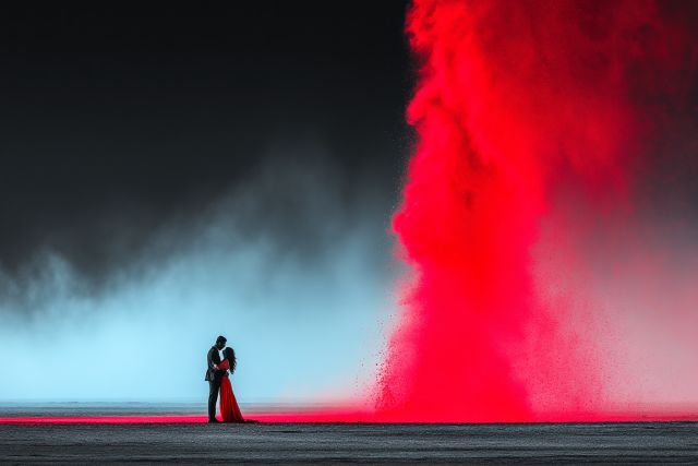In a composition where fantasy skirts the edges of reality, a couple stands enfolded in an embrace, their silhouettes etched against the explosive backdrop of a vibrant crimson plume. This striking tableau captures a moment of pure connection amidst an otherworldly spectacle reminiscent of the fierce intensity and uninhibited spirit found at the Burning Man festival. The stark contrast between the deep blues and vibrant reds evokes a powerful visual drama, symbolizing the passion and stark boldness often celebrated in love's dynamic expressions. Here, the surreal landscape becomes a playground for a theatrical display of emotion, where love is not merely felt but seen in waves of color, sweeping across the barren space with the force of a tempest. The ground mirrors this eruption in a subtle echelon of red, hinting at a world where boundaries blur and the earth itself reacts to human sentiment. This artwork not only captures the eye but also pulls the viewer into a narrative that is as much about the environment as it is about its human subjects, allowing us to ponder the profound connections between nature, art, and human emotion.