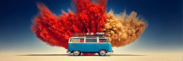 Exploding Colors: Vintage Van Ignites Under Vast Sky