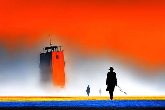 Bathed in the otherworldly glow of an incandescent, tangerine sky, a lone figure strolls across a striking spectrum of colors that spill across the ground like liquid jewels. The horizon merges fiery oranges with the sharp outline of a tall, mysterious structure, whose rustic presence whispers of isolation. This image artfully blends the stark vast contrast of a surreal, vivid backdrop with the chilling calm of silhouetted individuals moving towards destinations unknown. It suggests a narrative that resonates with the thrill of an unfolding drama, the poignant solitude amid communal celebration known at the Burning Man festival. This artwork mesmerizes viewers, inviting them into a world where the boundaries between the fantastical and the real blur, where every hue and shadow tells a story of human endeavor, momentary encounters, and the ceaseless pursuit of the extraordinary.