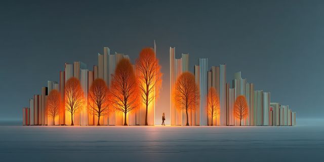 Amber Hues Illuminate the Silhouette of a Cityscape Crafted from Books
