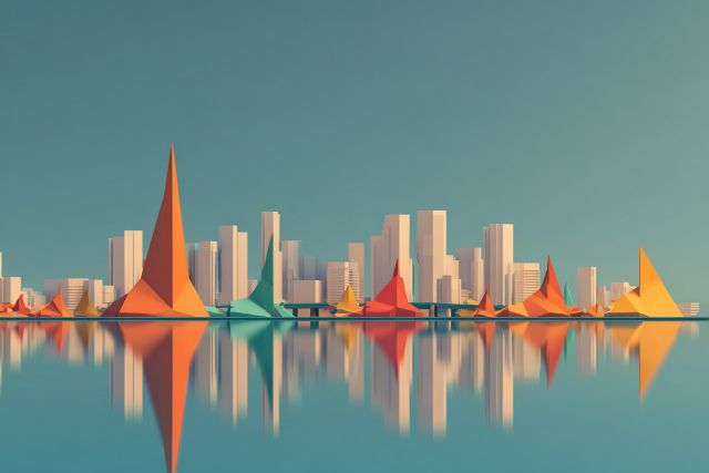 Dive into a visual odyssey where the rhythmic silhouettes of Miami’s skyline blend seamlessly with the bold intricacies of origami-inspired design. This artwork redefines the classical skyline through an abstract lens, creating a series of sharp, geometric peaks that mimic the art of folded paper. Vivid orange, serene blue, and bursts of vibrant teal transform into a harmonious palette, reflecting both the tropical warmth of Miami and the cool depths of its surrounding waters. Each structure, stylistically rendered as an angular, three-dimensional form, juxtaposes against the smooth, mirror-like surface below, suggesting a city floating in tranquil stasis. The artwork, resonating with a minimalist ethos, strips away the hustle and bustle of city life, offering a contemplative view that invites viewers to explore the essence of architectural symmetry and color relationships. As the origami tips point skyward, they guide the eye, prompting a meditation on the dynamics of urban landscapes and the tranquility of artistic abstraction. This piece serves as a stunning metaphor for the transformative power of art — turning a bustling cityscape into a peaceful, imaginary escape.