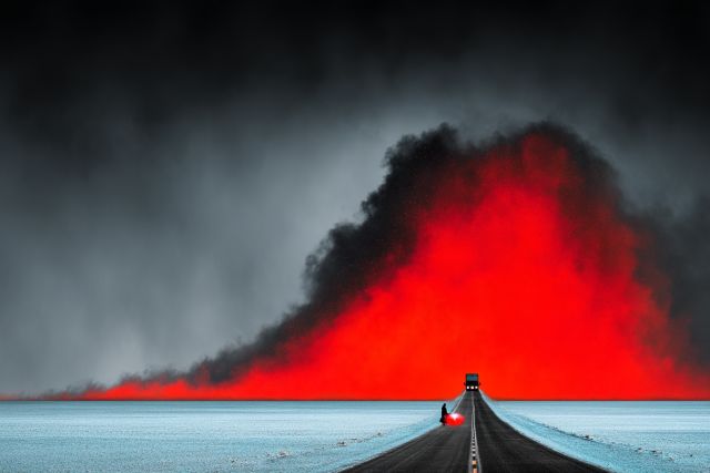 Enigmatic Journey Through Crimson Inferno on Highway Canvas