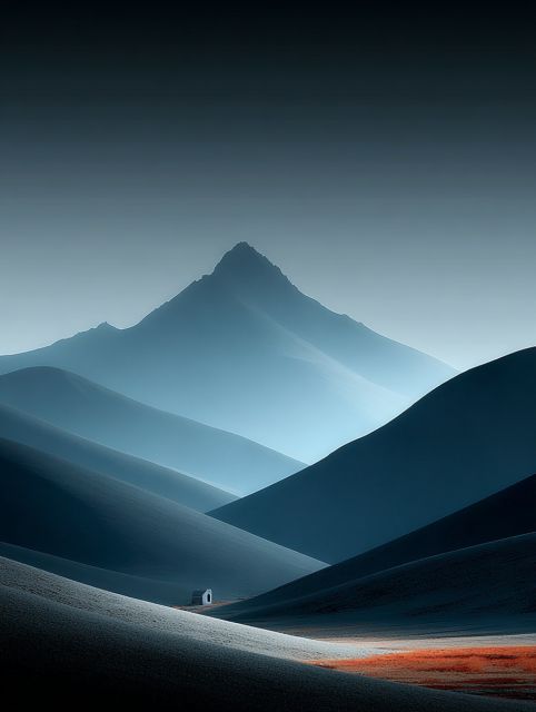 Amidst the vast tranquility of nature, the 'Serene Blue Peaks' presents a stunning portrayal of minimalist mountain beauty. The artwork masterfully brings forth an abstracted mountainous landscape washed in a palette of cool blues and muted earth tones that evoke a sense of calm and introspection. Subtle gradients dance along the rolling dunes, leading the eye from the soft, sandy foreground tinted with hints of warm rust, up to the formidable, sharply defined peak that slices through a misty sky. This geometric abstraction of natural forms strips down the chaos of the wild into its mere essence, offering a soothing simplicity. Each line and contour is infused with precision, creating a rhythm that resonates with the soul's quietest whispers. As the minimalism guides your gaze, the subtle interplay of light and shadow carves out a space for meditation and quietude, transforming any environment into a sanctuary of peace.