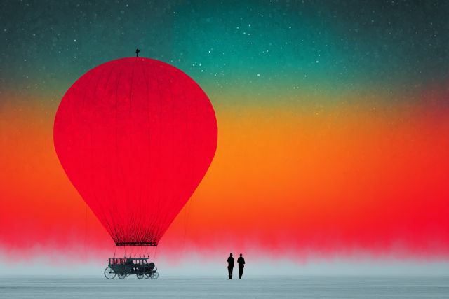 Amid a canvas of twilight hues, a majestic red balloon emerges, transcending above a mystical, fog-laden landscape that blurs the boundary between reality and dreamscape. As the horizons bleed into a spectacular gradient of fiery oranges and deep indigos, speckled by a starlit sky, two silhouetted figures seem to wander toward this enigmatic spectacle. The oversized, vibrant balloon, securing a whimsical carriage, hovers silently, adding a touch of surrealism that captivates and intrigues. The stillness of the scene is palpable, as if time itself has paused to behold the marvel of human ingenuity and nature’s splendor in one frame. This image stirs the imagination, evoking tales of adventure, serene escapades, and the pure joy of exploration. The artistry of the composition lies not just in the striking contrast of colors and the simplicity of forms but also invigorates a dialogue between the observer and the vast, unknown stretches of the universe mirrored in this serene encounter. It encourages one to ponder over the journeys less traveled, the quiet moments of beauty that life offers, when one dares to look beyond the immediate.