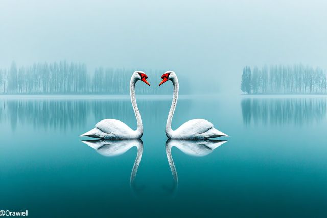 Enveloped in a serene mist, the elegant figures of two white swans create a striking symmetrical display on the calm surface of a mysterious lake. Their graceful necks curve gently towards one another, forming a delicate heart shape that symbolizes purity, unity, and love. The subtle ripples in the water around them seem to hold the world at bay, creating a secluded haven where these majestic creatures commune. The muted blue and grey hues of the environment evoke a sense of quiet isolation, enhancing the ethereal beauty of the scene. As the fog lingers amongst the distant line of slender trees, it adds a layer of mystique and depth to the composition. This image invites the observer to pause and reflect, serving as a testament to the peaceful coexistence and intrinsic beauty of nature’s creations. The stillness of the lake and the soft light that permeates the scene suggest moments of introspection and tranquillity, making this a captivating piece of art that draws viewers into its tranquil realm.