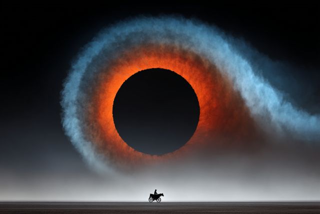 Under the vast desert sky, an ephemeral spectacle unfolds as a lone cyclist moves towards a mesmerizing celestial event—the Eye of the Sahara. The image, a dramatic concoction of nature and fantasy, marries the stark, boundless landscape of Mauritania’s Richat Structure with a surreal, Burning Man-inspired tableau. Above, a colossal ring burns with an inner fire, the colors transitioning from a fierce orange to a deep, tranquil blue, encapsulating the passage from day into night. This artwork masterfully portrays a scene of adventure and mysticism, pulling the viewer into a story written across the sky and earth. Here, the rider’s journey symbolizes an odyssey of discovery and reflection, a searching glide across the ancient heartbeat of the desert. Every hue and texture presented beckons to those who seek the thrill of the unknown and the beauty of uncharted terrains.