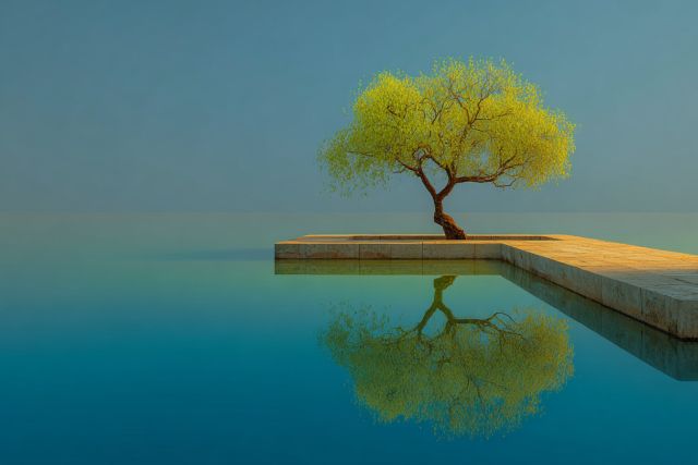 Eternal Reflections: A Lone Tree's Dance on Serene Waters