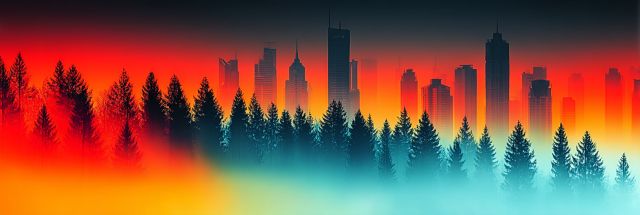 A spectacular fusion of nature and urban mystique envelopes the viewer in this vibrant depiction of the New York skyline set against a brooding forest. As the sun settles below the horizon, the sky ignites in fiery hues of orange and red, casting a luminescent glow that reflects off the towering skyscrapers. The city, usually buzzing with ceaseless energy, is eerily tranquil, overshadowed by the towering pines at the foreground. These trees, shrouded in mist, add a layer of mystery and serenity, contrasting sharply with the hard, metallic lines of the urban structures. The artwork invites the viewer into a world where nature and civilization coexist in a surreal, dream-like harmony. The colors transition smoothly from a deep, passionate red to a cool, soothing blue at the crest, suggesting a balance between fervor and calm. This artistic rendering, inspired by the essence of the Burning Man festival and the artistic techniques of Caras Ionut, plays with elements of fantasy and reality, making it a powerful visual statement that captivates and intrigues.