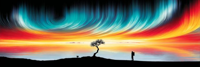 Enveloped by the surreal beauty of a twilight horizon, an evocative image captures a singular, contemplative figure standing beneath an ancient, solitary tree. As darkness gently falls over the landscape, the skies animate with an overwhelming display of the Aurora Borealis, painted in vibrant hues of blues, whites, and fiery oranges. This is not just any depiction of the Northern Lights; the scene is transformed into a surreal spectacle reminiscent of the whimsical scenes from the Burning Man festival, merging the mystic serenity of nature with the fervent energy of human celebration. The horizon bleeds into a melting pot of colors, suggesting the quietude of dusk intermingling with the wild abandon of night festivals. Each brushstroke and color blend tells a story of solitude, wonder, and connection to the cosmos. This piece invites the viewer to linger in the moment, to feel the cool breeze that whispers across the open spaces, and to contemplate the profound solitude that the image emanates. It's a journey not just through a stunning natural phenomenon but also a deep dive into the emotional landscape that such a mighty spectacle can inspire. The artwork becomes a mirror reflecting the viewer's thoughts, emotions, and inevitably, their awe and admiration for this breathtaking intersection of art and nature.
