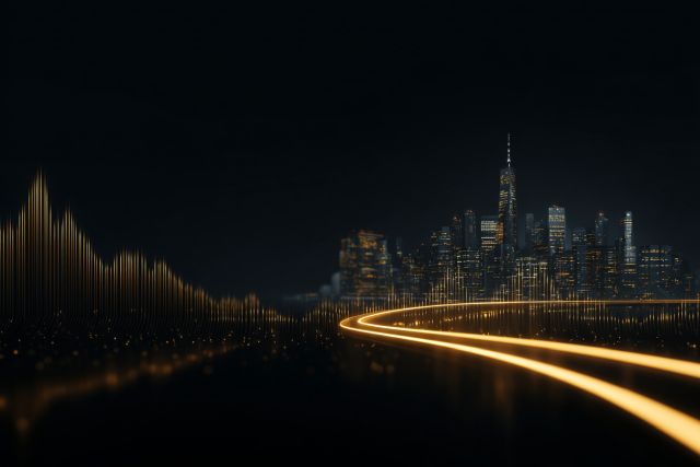 Plunge into a mesmerizing urban narrative where the robust energies of a bustling city blend seamlessly with the abstract nuances of financial ascent. In this artistic masterpiece, a highway—bathed in golden light—curves gracefully towards a horizon dominated by the iconic skyline of New York City. This is more than just a depiction of a city; it is a visual allegory of ambition and progress. The road, illuminated by the warm, golden hues, symbolizes a journey towards financial success, mimicking the fluctuations of a financial chart that promises ascension and prosperity. The distant skyline, etched against a backdrop of a dark, smooth gradient sky, enhances the composition, adding depth and a touch of enigma to the visual experience. The golden highlights do not merely shed light on the path but also accentuate the high-rises’ architectural details, creating a harmonious interplay between light and shadow that is both captivating and thought-provoking. This piece is not just an artwork; it’s a narrative woven with light and architecture, inviting viewers to contemplate the symbiotic relationship between urban living and economic growth.